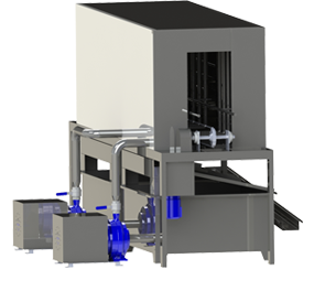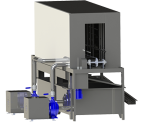 Lavadora de caixas de uso interno com sistema de lavagem, enxague e sanitização com opção de aquecimentos elétrico ou vapor.